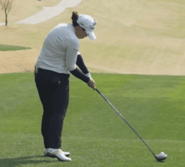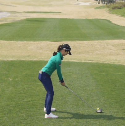 위의 한상희 프로 드라이버 티샷 움짤을 보시면 백스윙 탑에서 다운스윙으로 가면서 머리가 밑으로 떨어지는 것을 보실 수 있을 겁니다. 이는 실제로는 무릎과 힙이 살짝씩 낮아지면서 머리가 따라서 내려 가는 현상인데요. 이렇게 앉는 듯이 내려 갔다가 실제로 볼을 칠 때는 앉으면서 밟았던 땅의 힘을 상체로 보내기 위해 무릎을 튕겨 올리면서 파워풀한 스윙을 할 수 있는데요.