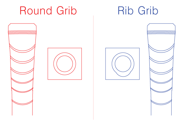 왼쪽에 보시는 그립을 라운드 그립이라고 합니다. 그립을 수평으로 잘랐을 때 거의 완전한 원에 가까운 형태이고요. 우측의 그립을 수평으로 잘랐을 때 한쪽 부분이 튀어나온 모양을 하는 그립을 립 그립이라고 합니다. 저는 개인적으로는 많은 사람들이 립그립을 사용하면 좋겠다고 생각하지만 그 중에서도 처음 장비를 구입하시는 분들은 꼭 립 그립을 사용 하시기를 바랍니다.