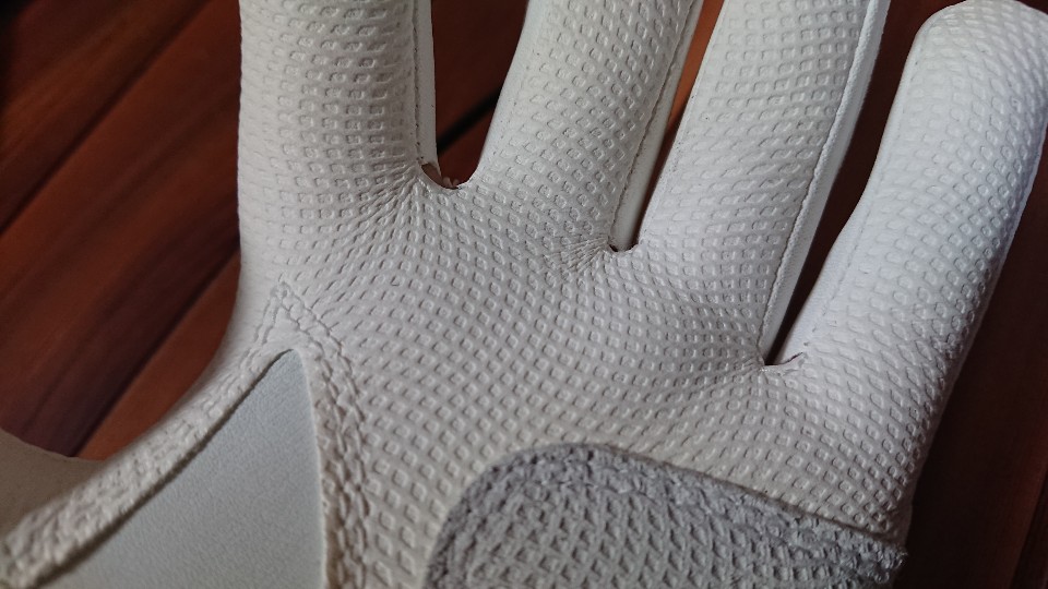 손바닥 부분입니다. 우선 특징은 팜 그림이 되는 손날 부위에 덧댄 흔적이 있고요. 제일 중요한 골프채에 껴져 있는 그립에 난 패턴이 이 장갑에도 나 있습니다. 그물처럼 줄이 가 있기도 하지만 요철 같은 구멍이 뿅뿅뿅뿅 나있는 거죠.