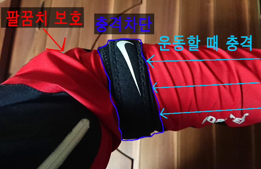 엘보보호대를 착용하면 위와 같은 모습이 되는데요. 어떻게 엘보를 보호해 주는지 설명 드리겠습니다.