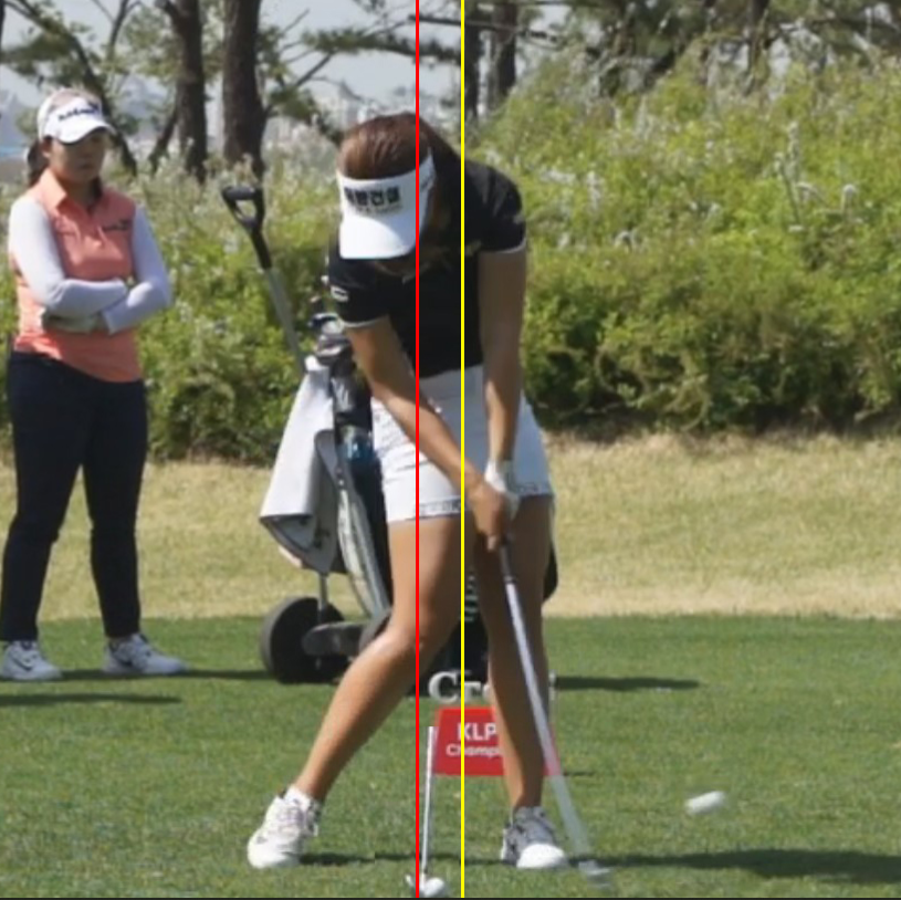 오늘 MY 문영 퀸즈파크 챔피언십 2019 에서 올해 1승, 생애 2승을 차지한 초장타자 김아림 프로의 어드레스와 임팩트 직전의 모습입니다. 우선 클럽헤드를 잘 보세요. 어드레스 때는 누워 있던 것이 임팩트 때는 발딱 일어나 있습니다. 그 이유는 임팩트 때는 원심력의 힘에 의해서 어드레스 때의 손의 위치 보다 손이 들리면서 팔과 샤프트의 각도가 일자로 됩니다.