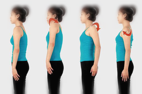 위의 움짤 처럼 손을 어깨에 대고 뒤로 돌려 줍니다. 많이 하실 필요도 없이 두 바퀴 정도만 돌려 준 후에 차렷자세를 하면 위에서 1번에서 말씀 드린대로 머리를 누가 위로 당긴다고 생각하시면서 어깨를 뒤로 돌리면 위에서 봤던 똑 바로 선 차렷 자세가 됩니다.