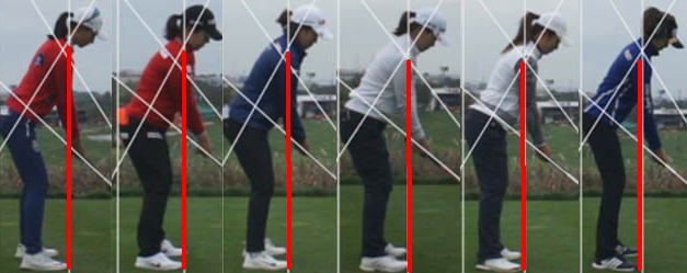 위의 사진은 가장 최근에 갤러리 다녀 온 '하나금융그룹 챔피언십'에서 리디아 고의 아이언 티샷입니다. 선을 긋지 않아도 왼쪽의 어드레스 자세보다 임팩트시에 고개가 많이 숙여져 있는 것을 알 수 있습니다. 아주 어려운 것인데 이런 저런 생각하지 마시고 다운 스윙 때 인사를 하면서 고개를 밑으로 숙여 주시면 척추각도를 최대한 유지할 수 있습니다. 물론 리디아 고의 경우는 인사하면서 볼을 치는 것은 아닙니다. 엄청나게 유연하게 힙슬라이딩 및 턴을 하면서 고개가 떨어진 것 처럼 보이는데요. 우리는 사실 힙턴 어렵잖아요. 허리가 접힐 정도로 그냥 인사하세요. 그러면 위의 사진에서 오른쪽 처럼 임팩트가 될까요? 아니요. 안됩니다. 최대한 어드레스 때의 고개 높이를 맞추는 정도의 파스춰가 유지 될 겁니다. 프로 골퍼와 우리가 볼을 쳐온 시간과 근력 운동 한 시간, 유명 교습가에게 레슨 받은 시간, 빈스윙을 한 시간이 너무 다르니까요. 우리만의 파스춰만 지키는데 인사하듯이 고개를 밑으로 숙이는 것이 없습니다.