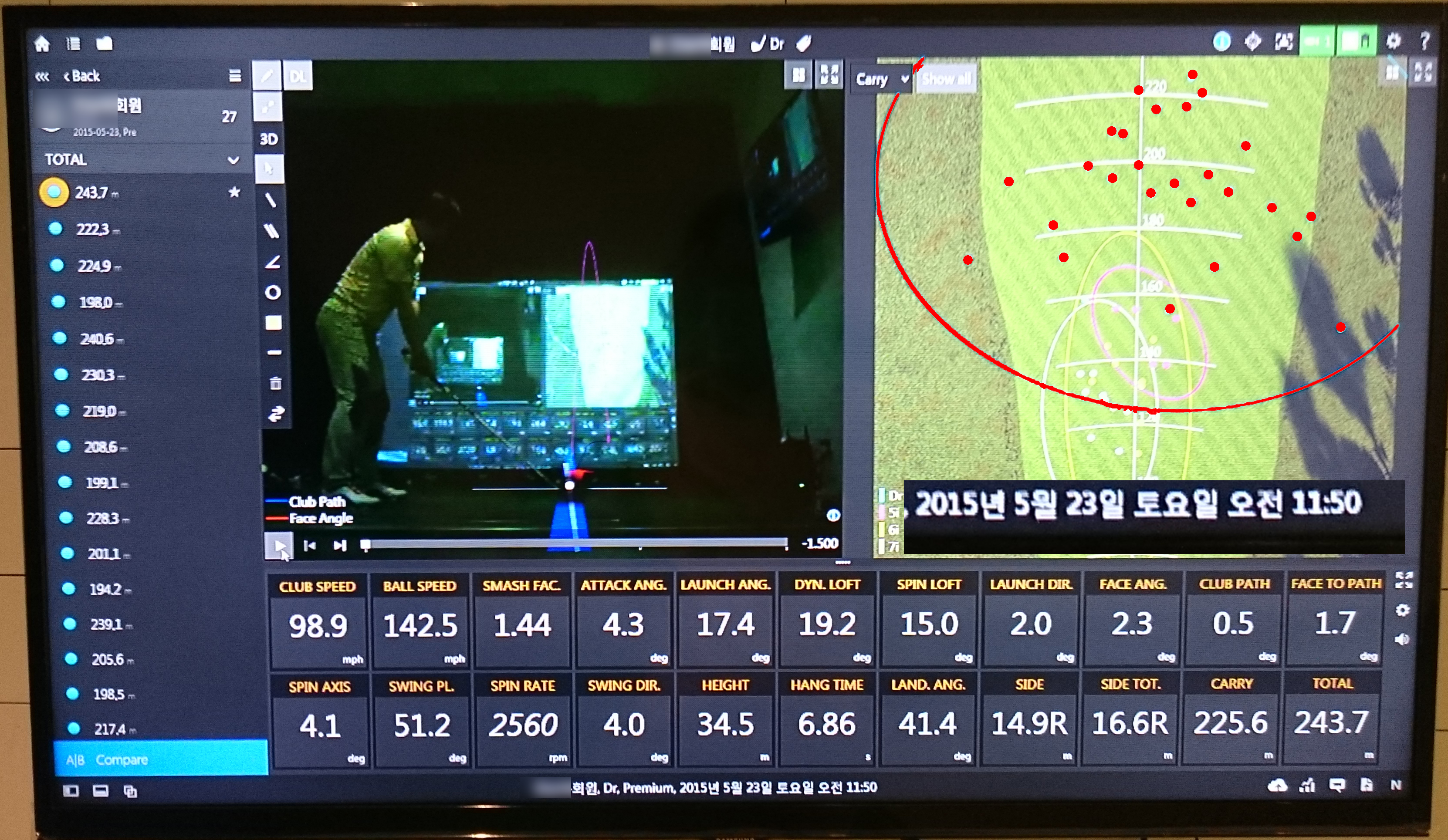 저는 처음에 독학을 하다가 몸에 베인 것이 '배치기'입니다. 거기에다가 드라이버 비거리 욕심에 오버스윙까지 했죠.(사실 오버스윙 좋아 합니다. 한방만 잘 맞으면 위의 데이터처럼 런 포함해서 총 비거리가 243.7M나 날아갑니다.) 왼쪽의 드라이버 비거리의 편차를 말씀 드리지 않아도 오른쪽에 분포된 빨간 점들을 보시면 얼마나 엄청난 샷을 했는지 짐작이 가실 겁니다. 그러다가 2015년이 9월 쯤에 골프엘보가 심해져서 젓가락도 들지 못하고 휴대전화를 3초 이상 들지 못할 지경이 와서 레슨, 연습, 헬스 PT 모든 것을 끊고 치료에만 전념했습니다. 그러다 보니 반년 정도 지나고 나서 골프채를 다시 들 정도가 되더군요 그래서 저의 선생님 이지연 프로님을 다시 찾아가서 레슨을 받기 시작했습니다.