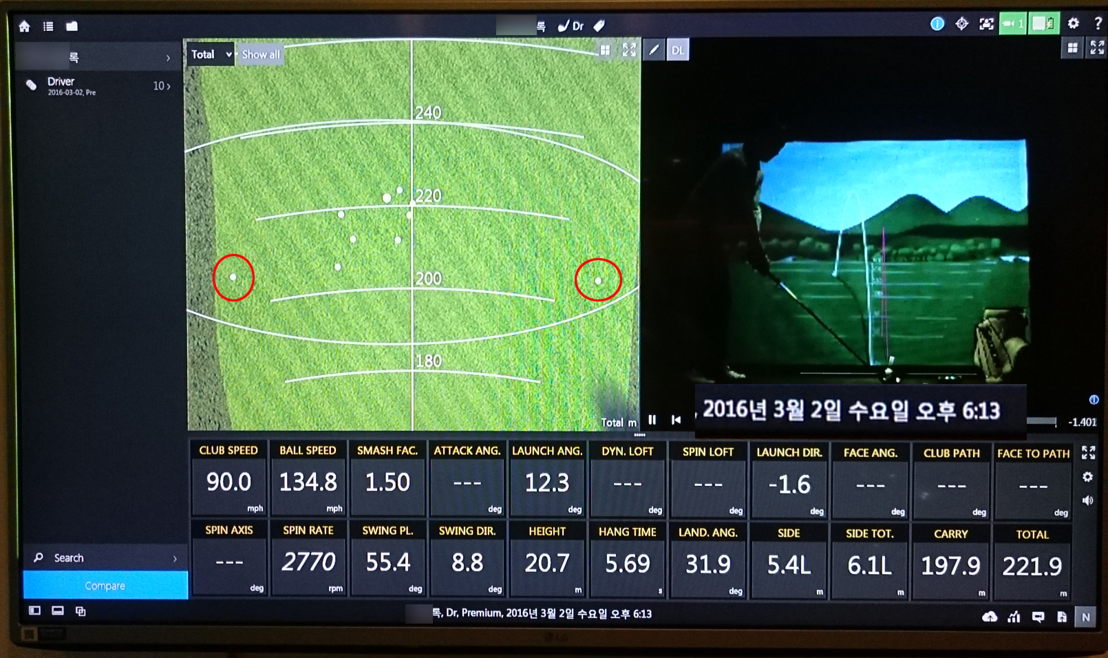 위의 움짤을 보시면 볼 10개를 쳤는데 좌.우측 빨간선을 칠할 2개 외에는 나름 드라이버 티샷이 모이게 되는데요. 이 때 맨위의 난잡한 드라이버를 칠 때와 비교하면 크게 달라 진 것이 99.89mph(44.65m/s)의 클럽스피드 및 134.8mph(60.26m/s) 의 볼스피드가 저의 최고로 용 쓰던 시기였다면 이듬해 2016년도 레슨 때는 90mph(40.23m/s)로 스윙스피드가 줄었습니다. 그렇습니다. 척추각을 유지하기 좋은 것은 내가 제일 용써서 낼 수 있는 스윙스피드 및 볼스피드보다 적은 힘을 내는 것입니다. 저의 경우는 10% 가량 줄었네요.