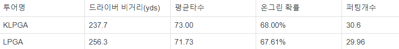 KLPGA선수들의 경기력을 엿볼 수 있는 드라이버 비거리는 평균 237.7야드입니다. 즉 런포함 217.35M입니다. 평균 타수는 73타, 1오버파 이구요. 온그린 확률 평균은 68%입니다. 18홀 중 12.24홀 온그린 되고, 5.76 번은 어프로치를 한다는 이야기입니다. 아마추어 골퍼의 통계는 없지만 대략 온그린 확률은 20%대라고 전해 들었습니다. 평균 퍼팅횟수는 30.6회입니다.