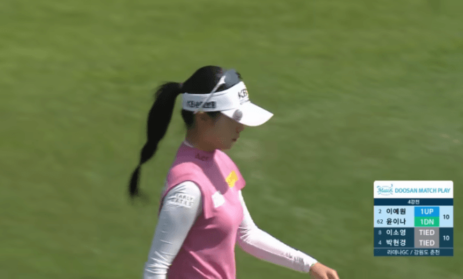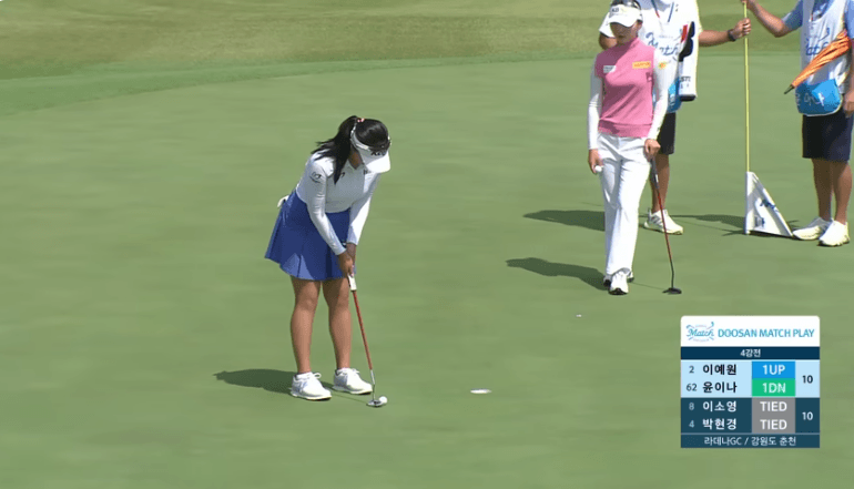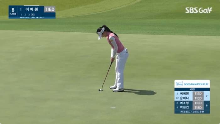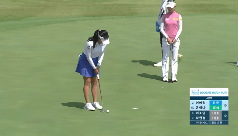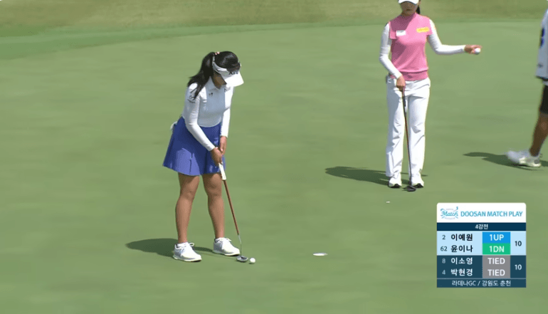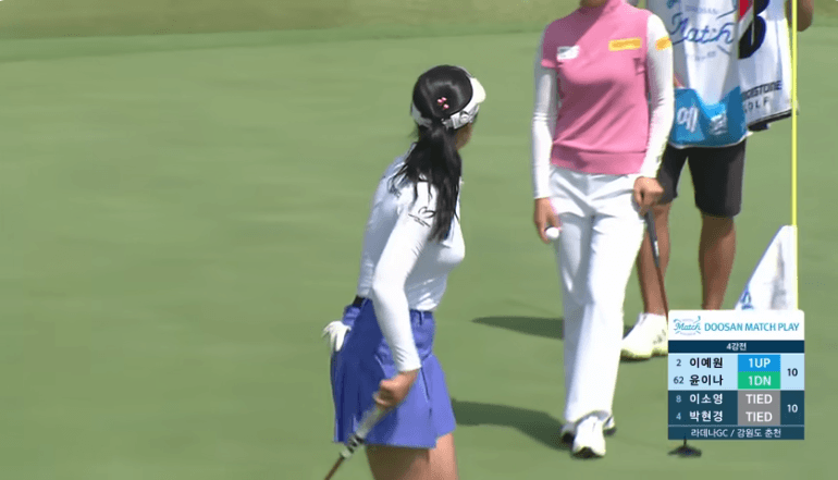 이예원 프로는 3온으로 비교적 먼 거리에서 파펏을 놓치면 바로 보기펏이 되고, 약 45cm 정도의 파펏을 남긴 윤이나 프로가 홀인하면 1UP이 되어 전체 스코어는 올 스퀘어로 바뀌는 상황에서 윤 프로의 룰 위반으로 인한 심리적인 수 싸움이 있었던 것으로 판단 된다.