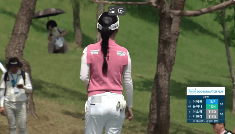 추가 내용> 그 전 홀 상황을 찾아봤다. 띠용용용~ 아래 움짤을 보면 8번 홀에서 이예원 프로가 파펏을 하고 있는데 보기펏을 한 윤이나 프로가 스코어 카드 마킹하면서 다음 홀로 가고 있다. 따라서 마무리 퍼팅까지 봐주지 않는 것은 쌍방의 전술이고 매너이다. 고로 2번에서 적은 이예원 프로의 비매너 상황은 2개가 아닌 1개로 변경.