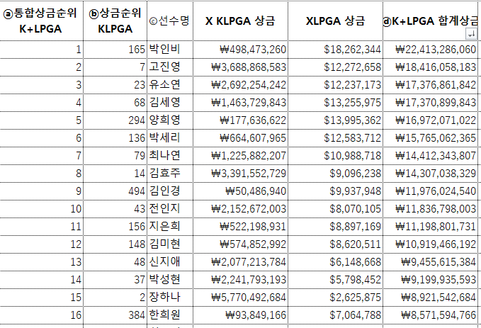 KLPGA상금 + LPGA상금 데이터까지 넣으면 복잡해 져서 두 투어의 합계상금만 넣었습니다. ⓐ표의 첫번째는 두 투어 통합(K+LPGA)상금 순위 ⓑ2번째는 KLPGA 상금 순위 ⓒ선수명 ⓓ두 투어(K+LPGA) 합계상금액수로 최대한 보기 편하게 만들었습니다.