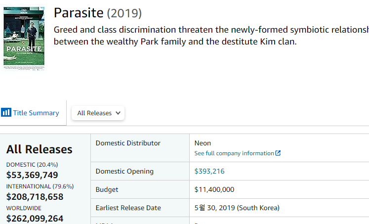 (다만 번외의 이야기 입니다만 수출금액까지 합쳐서 본다면 전세계에서 2.09억$를 벌어 들인 기생충을 1위, 1.84억$를 벌어들인 국제시장을 2위로 봐야겠습니다.)