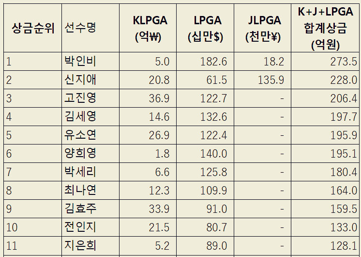 이번 글에서는 드디어 일본 JLPGA에서 활약한 한국 여성 프로골퍼의 상금순위를 알 수 있게 되어서, LPGA , KLPGA, JLPGA 소위 말하는 여성 프로 골퍼 3대 투어에서 활약한 모든 한국 여성 프로골퍼들의 상금순위를 합산해 봤습니다. 전에 포스팅한 각 나라별 상금 순위와는 또 다른 프로골퍼들의 면모를 보실 수 있을 겁니다.