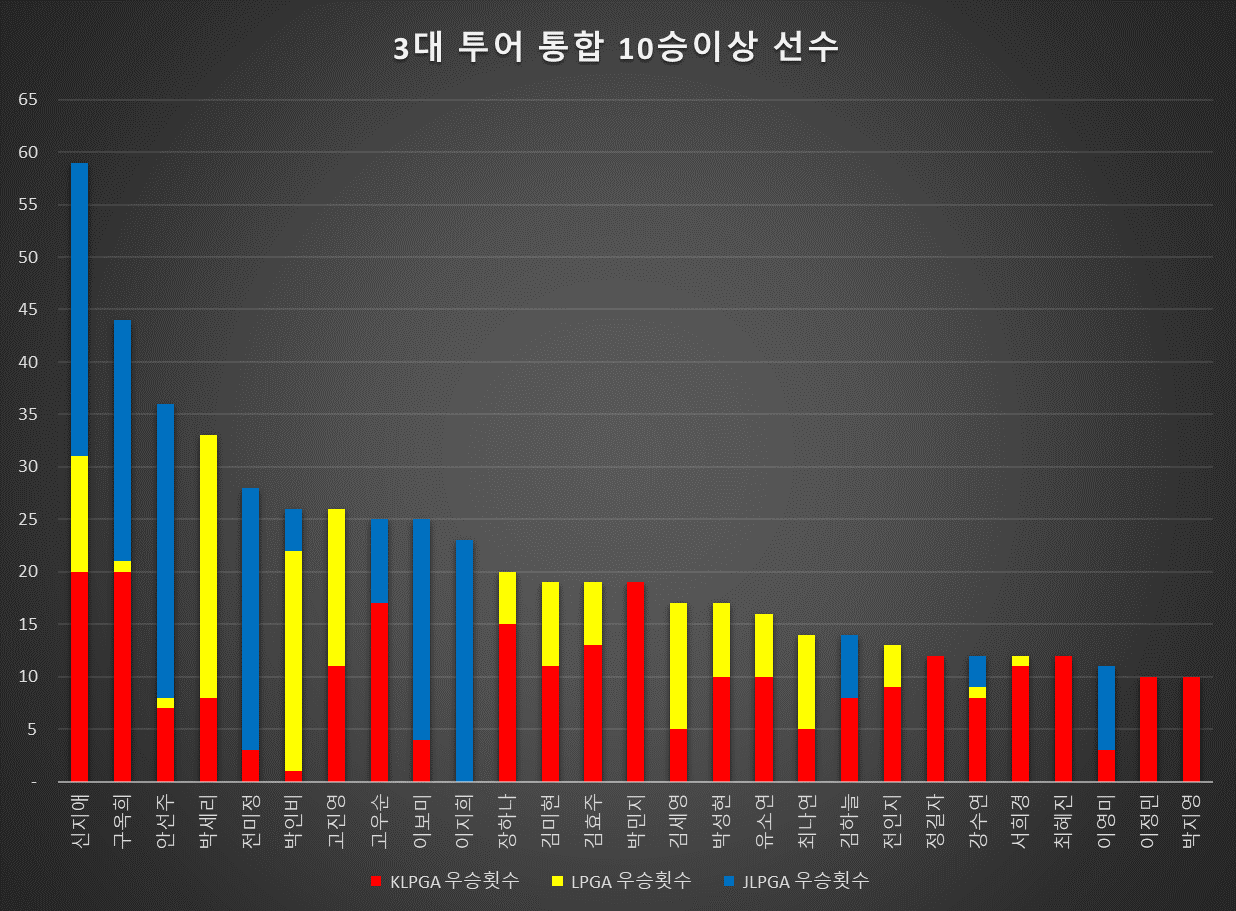 | 입회번호 | 이름 | KLPGA | LPGA | JLPGA | 3대투어 계 |