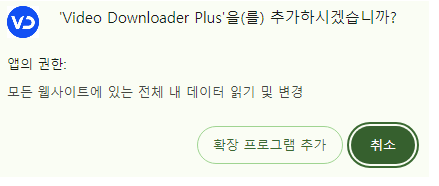 7. 아래와 같이 'Video Downloader Plus'을 추가하시겠습니까?라고 묻는 창이 나옵니다. '확장 프로그램 추가' 클릭해줍니다.