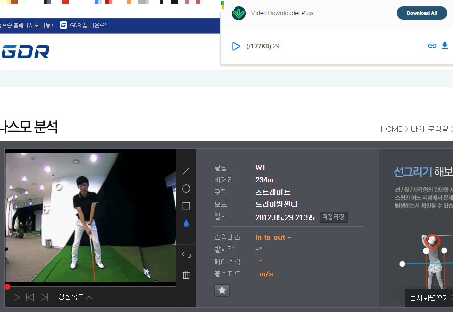 15. 음. 혹시나 해서 봤더니 'GDR 골프 연습장'의 나스모도 저장 가능합니다. 본인의 나스모뿐만 아니라 아래 사진처럼 프로들의 나스모도 다운로드 가능하니 공부 차원에서 좋아하는 프로 나스모도 저장해서 핸드폰에서 자주 보시면 좋을 거 같습니다. GDR도 방법은 같습니다. 홈페이지 로그인 후에 다운로드하고자 하는 나스모를 재생시키면 '비디오 다운로더 플러스'에 숫자 1일 뜨고 그것을 누른 후에 다운로드 버튼을 클릭하여 저장~ 끝입니다.