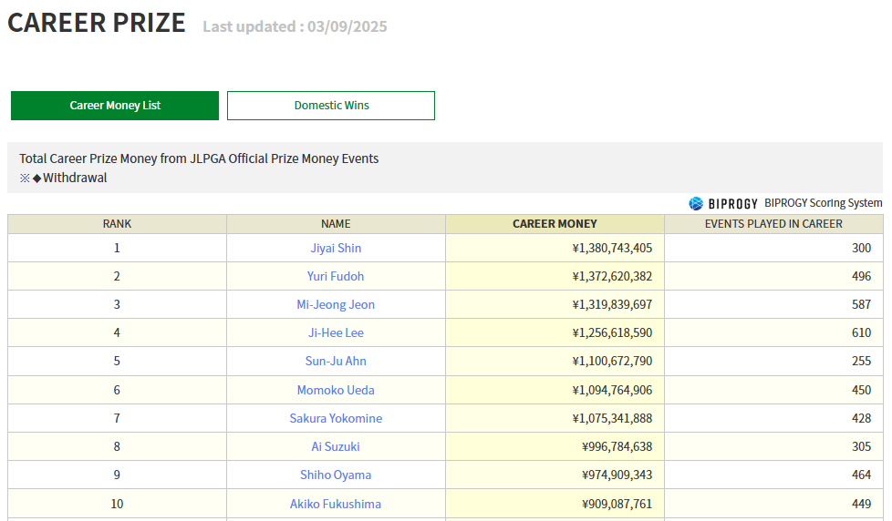 2014년부터 2024년 현재까지 총 25번의 우승을 하며 JLPGA 역대 상금왕 2위를 기록 중입니다.