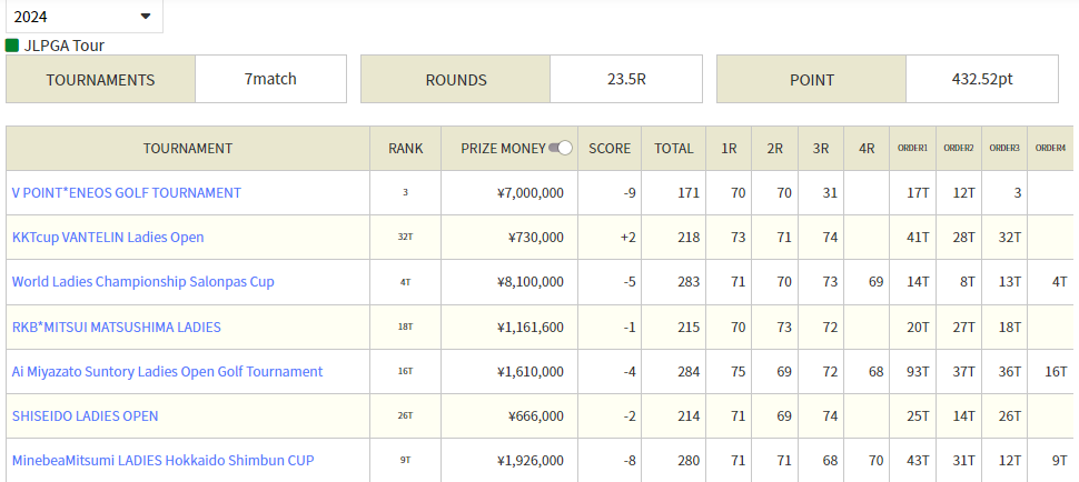 | 17.08.24 | JLPGA | 니토리 레이디스 골프 토너먼트 | ¥18,000,000 |