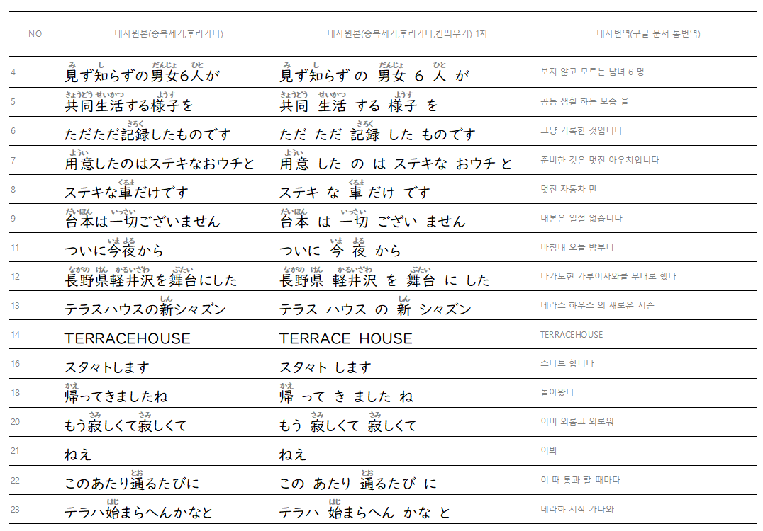 1. 테라스 하우스 : 새로운 시작 (파트1 : 에피소드 7편 대사)- 이 시즌은 다행인지 불행인지 총 6개 파트 중에서 파트1(에피소드 8개) 만 있었는데 내가 실수로 1~8 에피소드 중에 6번 에피소드 대사를 놓쳤다. 되돌리기엔 늦어서 그냥 작업을 했다. 쓰이는 단어가 비슷하다.