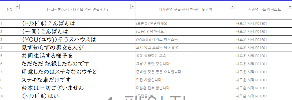 이렇게 총 93편의 테라스 하우스 대사를 엑셀로 공부용 자료로 만들어 봤다.