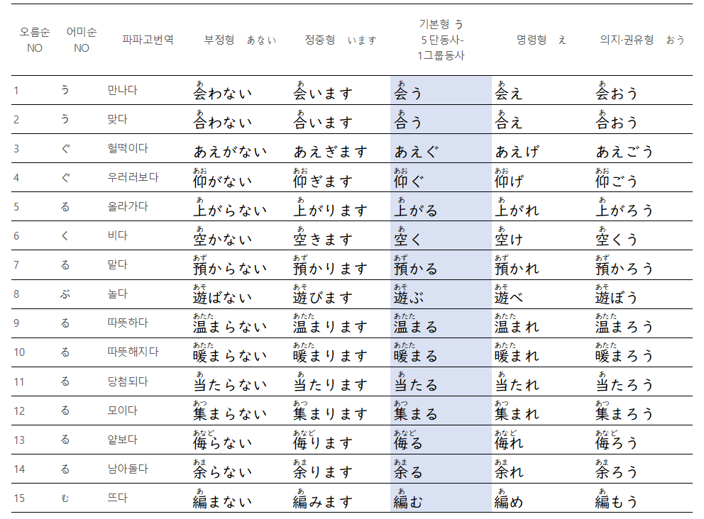 아래에 설명할 1단 2그룹 동사외 불규칙 동사를 제외하면 거의 모두가 5단동사가 되는데 이게 무슨 말이냐면