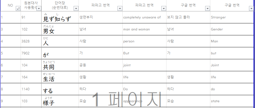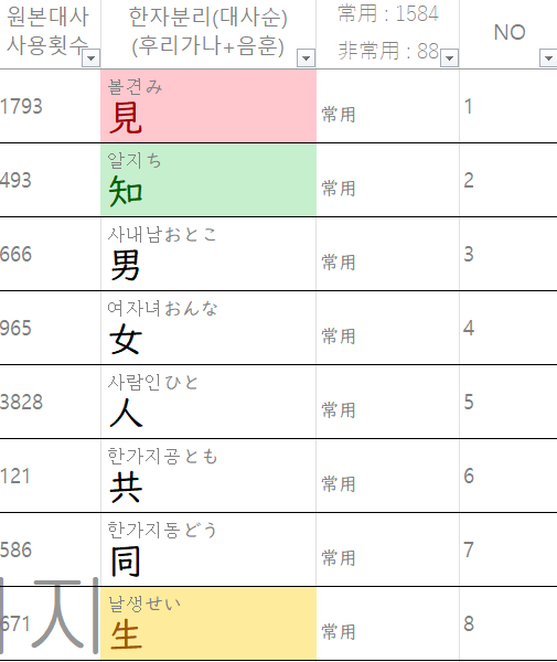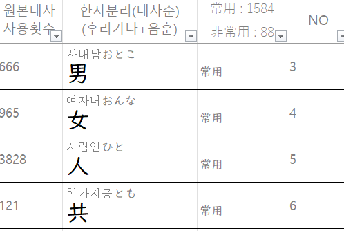 여기서 NO는 최대한 대사 앞쪽에 먼저 나온 단어순으로 되어 있고, 원본대사 사용횟수는 한자의 사용 빈도이다. 엑셀 순서 정리를 이용해서 사용횟수가 많은 순으로 봐도 좋을 거 같다. 또한 뜻 풀이는 역시 구글 번역이다.