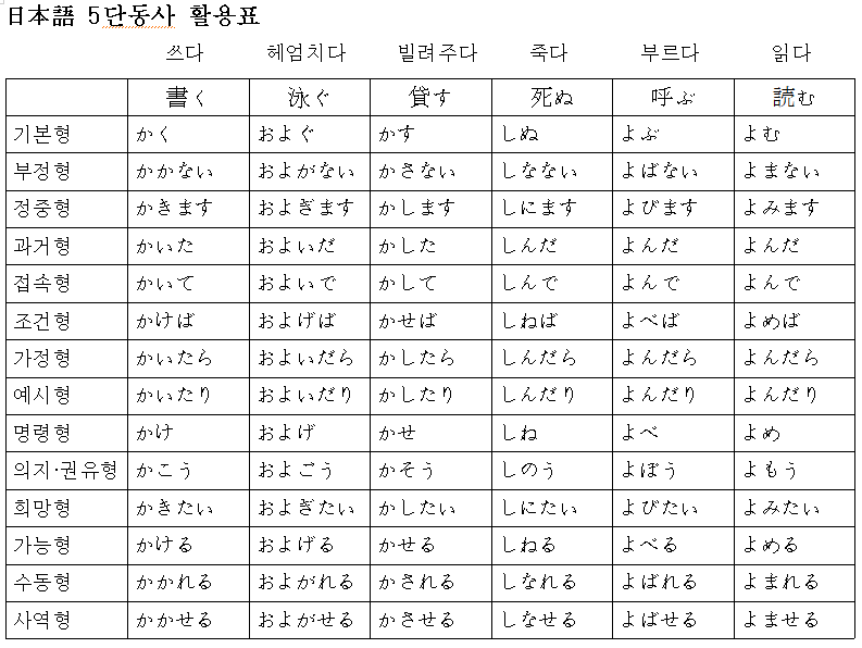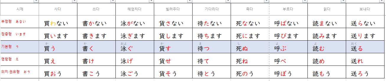 음. 이건 문법적으로 들어가는거라 나도 설명이 좀 힘이 든다. 이건 다른 사이트에 '일본어 동사 활용'이라고 쳐서 알아보자! 이것은 전문가가 설명하는 것을 보면 금방 이해가 같다. 이런 5단형이 기본이다. (물론 더 많은 형태가 있지만 그건 나중에.. 손대자!!)