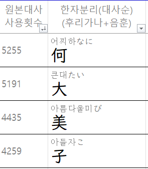 何 단어가 5255번 전체 대사 중에서 약 5%는 나오는 거 같다. 또한 大, 美, 子 이런 글은 이름에 많이 쓰여서 빈도가 높은 거 같은데 어쨋던지 공부는 알아서 필요한 행렬만 남기고 순서도 편하게 정해서 보면 될거 같다.
