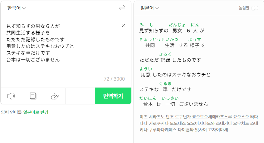 자! 일본어 및 한자 공부하는데... 왜? 테라스 하우스냐면 내가 좋아하는 일본 드라마는 '법정물'이나 '의학물'이 많아서 한자는 뭐 상용한자 내에 들어 오겠지만 일본어 자체는 '전문용어'가 많아서 실생활과 맞지 않아 보였다. '테라스 하우스'는 일반인들이 나와서 하는 일상용어들이 많은 것 같고, 씬이 좀 다양한 에피소드로 구성된다. 그리고 호스트들이 감상을 말하는 것도 생활용어라고 판단을 했다.