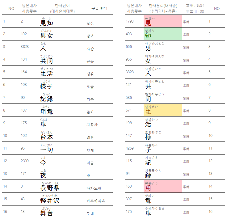 또한 일본 상용한자 2136자 맞나? 여튼 상용한자 중에 '테라스 하우스'에 쓰인 한자수는 총 1584자이고, 비상용 한자는 88자로 총 1672자의 한자가 쓰였는데, 상용 비상용을 아래와 같이 한자 우측 같에 표기 하였는데,
