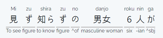 見To seeMi ずfigurezu 知らto knowshira ずfigurezu の^ofno 男女masculine womandanjo 6sixroku 人-iannin が^sbjga