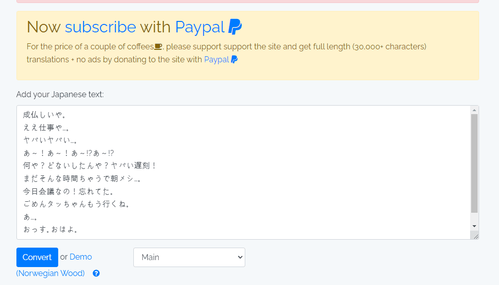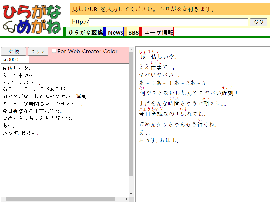 히라가나 메가네라는 사이로 한자에 후리가나를 달아 준다. 다만 아쉬운 것은 일본어는 상황별로 음독, 훈독을 하는데, 이 사이트에서는 음독, 훈독의 정확도는 대략 80% 정도 보면 되겠다(일상문장은 95%정도 됨. 지명과 사람 이름은 화자의 뜻을 따라가기 어려워서 어쩔 수 없이 약하다.). 아 그렇다고, 네이버 파파고는 더 좋냐하면 그렇지 않다. 문장에 맞는 읽기는 아니어도 한자에 대응하는 음독, 훈독은 100%다. 또한 일반 문장에 후리가나를 달아 주는 것 뿐만 아니라 HTML에서 쓸 수 있게 변환해 주는데, 자막 만드는 사람들에게도 좋을 거라 본다.