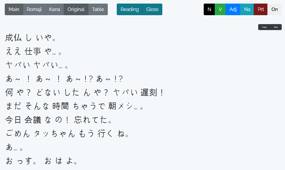 띄어쓰기 뿐만 아니라 로마자 후리가나 및 뜻, 한자를 히라가나로 바꾼 문장까지 제공하는데, 회원가입 시 한 번에 500자까지 변환 가능하다. 말말 하면 알기 어려우니 샘플 고고.