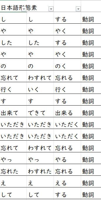 처음 일본어를 접했을 때 문장을 쪼개서 단어 찾기 및 아래와 같이 필터를 통해서 동사만 필터링 하면 '일본어 동사'의 형태를 알아보는 공부하기에 매우 좋다.
