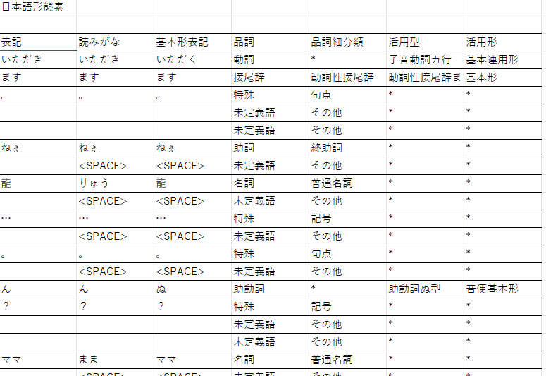시트 2에는 자막 문장의 형태소 분석을 넣어 봤다. 1명이라도 유용하게 쓰면 좋을 듯.. 싶다. 다른 거는 무시해도 되는데 쓰이는 동사의 기본형을 알려 줘서 좋다. 필터로 動詞 만 필터링 해서 보면 좋을 거 같다. 아래에 보면 いただき ます에 쓰이는 いただき라는 동사는 いただく가 기본형임을 알 수 있다.