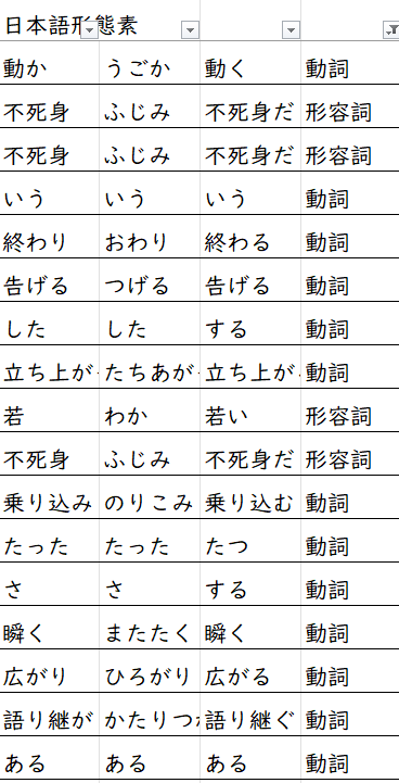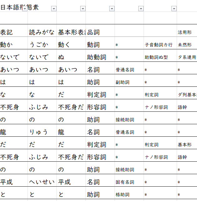 또한 엑셀 시트 2번에는 형태소 분석 사이트에서 분석한 내용도 들어가 있다. 일본어 문장을 넣으면 아래와 같이