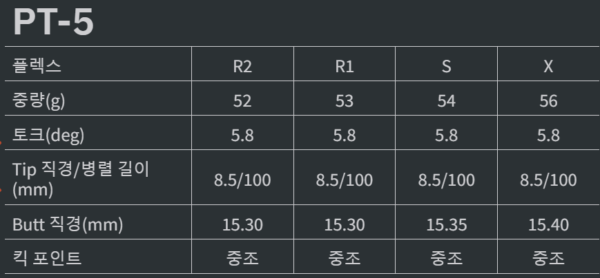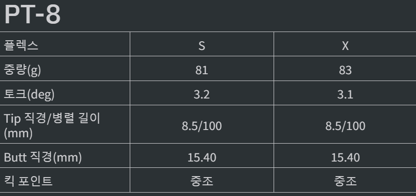 아. 샤프트를 분석하는 기본적인 방법은 저는 그저 무게라고 생각을 합니다. 아래 그라파이트 디자인 사의 투어 에이디 PT-5(50g대)와 PT-8(80g대) 샤프트 제원표를 보시면 50g대 샤프트 토크(뒤틀림에 저항하는 성질)가 5.8이고 80g대 샤프트가 3.2입니다. 숫자만 보면 PT-5가 PT-8보다 토크값이 높은데요. 그래도 강하가 뒤틀리는 것을 잡아주는 것은 PT-8입니다. 그 외의 성질은 거의 같습니다. 저는 여러분이 샤프트를 판단할 때는 그저 무게만 보시면 될 거 같습니다. 또한 많이들 논하는 플렉스를 보시면 각 단위별로 1g씩 변하다가 S에서 X로 갈 때 2g이 늘어 나는 것을 볼 수 있습니다.