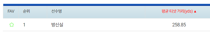 화면관계상 전체 선수의 비거리표를 올리진 않겠습니다. 현재 KLPGA의 장타왕은 방신실 프로로 약 259야드(약 237미터)의 비거리를 내고 하위인 손성화 프로가 202야드(약185미터)의 중간값인 약 211미보다는 약 7미터가 긴 218미터의 드라이버 비거리가 평균 드라이버 비거리입니다.