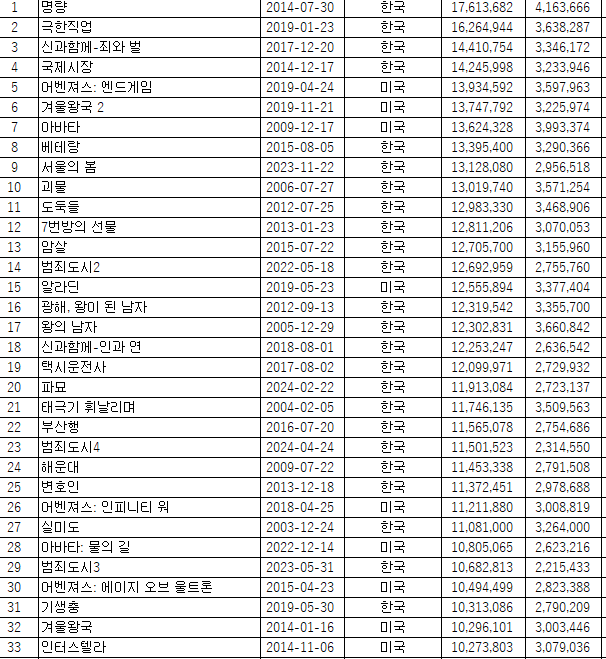 한국박스오피스 TOP20 (1972~2024) 표를 올려 보겠다~