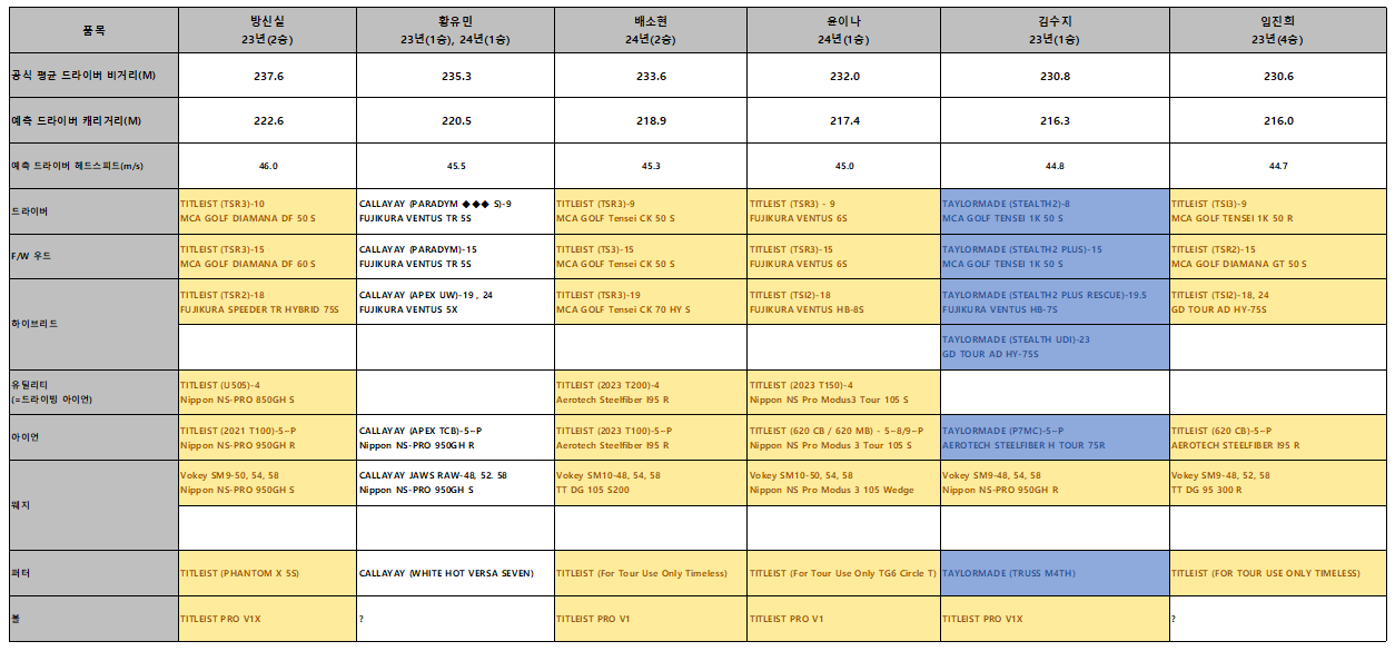 배소현 프로의 모든 클럽은 타이틀리스트입니다. 절대적인 것은 아니지만 아래의 KLPGA 23년 24년도 위너스 클럽에 든 1승 이상의 선수들의 장비를 보면 장타자들이 주로 타이틀리스트를 선호하는 경향이 있는 것을 알 수 있습니다 .