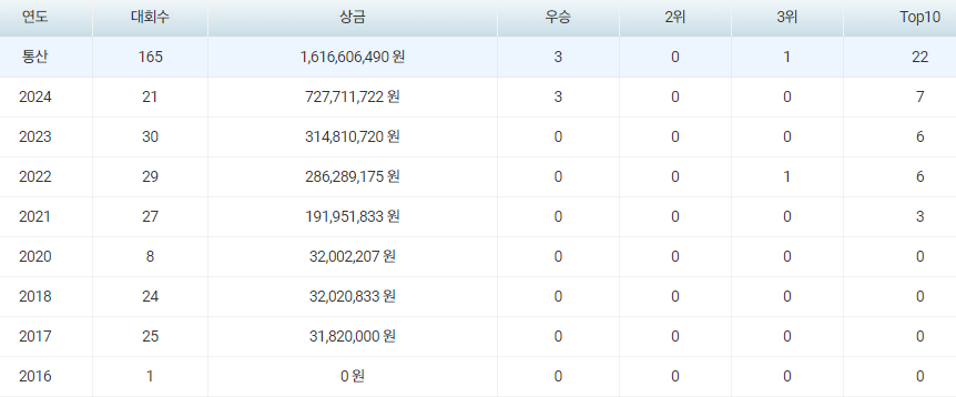 | 상금 | 727,711,722 원 24시즌 3승 |
