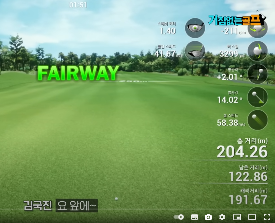 여러분이 좋아 하시는 김국진씨는 스크린 골프 데이터로 보면 첫홀의 드라이버 스매쉬 팩터가 아래와 같이 1.40입니다. 클럽 스피드 41.67m/s, 볼스피드 58.38m/s, 드라이버 비거리 204.26m라고 나옵니다. 아래 자료는 김국진씨 유튜브 거침없는 골프 ' 연예계 스크린 1티어 정명훈! 김국진에게 도전장을 내밀다! - YouTube' 편 4분 29초에 나오는 화면입니다.
