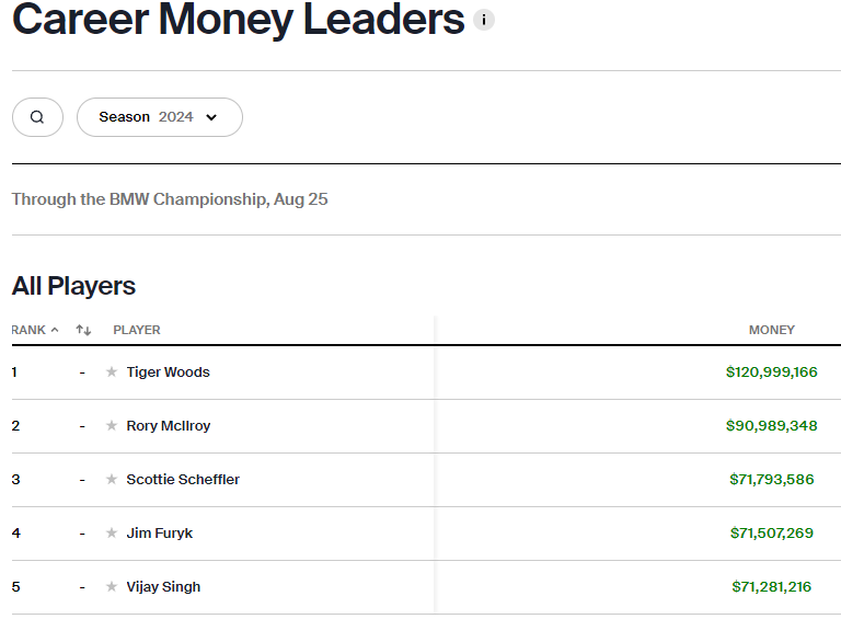 2018년에 PGA 투어에 입회하여 7년만에 PGA 투어 역대 상금 순위 3위로