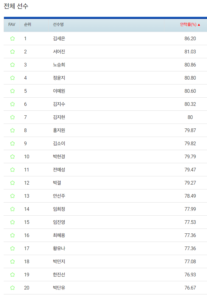 참고로 KLPGA 선수들의 드라이버 안착률은 아래 그림과 같이 1위 86.2% 부터 20위가 76.67%입니다.