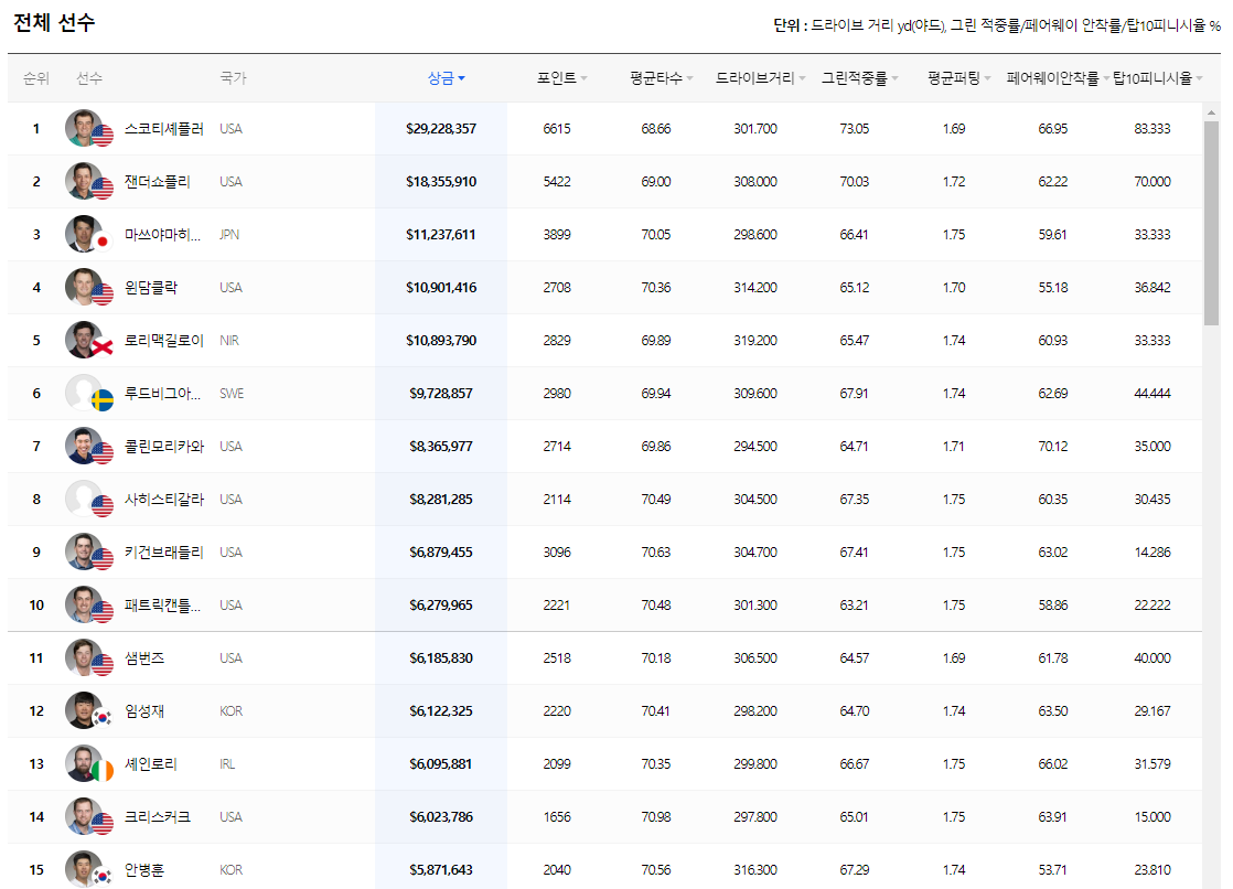 우선 스코티 셰플러 선수의 주요 골프 스탯을 살펴 보겠습니다. (출처 : PGA 홈페이지)
