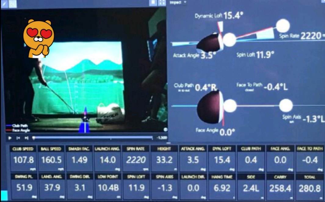 보통 어택앵글은 3~4도 정도 되는데요. 드라이버를 찍어 친다는 것은 쉽게 티를 낮게 꽂는다고 보면 되겠습니다. 그런데 재미 있는 것은 이렇게 1.3도 다운블로로 찍어 쳐도 스핀이 많이 먹어서 최대 높이가 29미터나 된다는 것입니다.