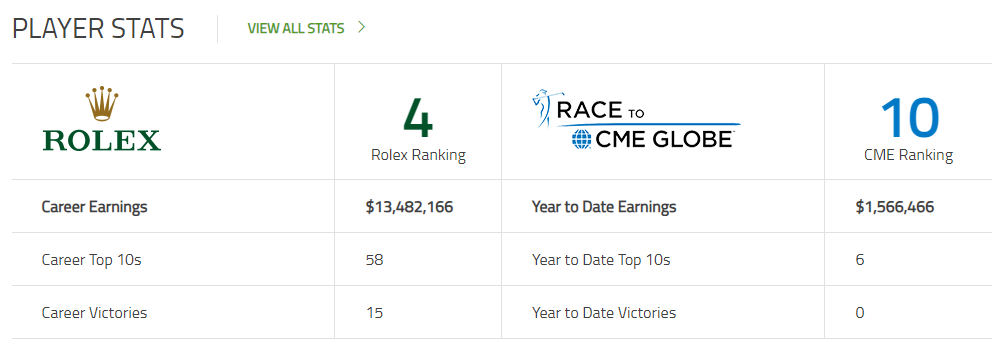 2024년 9월 1일 현재 LPGA 역대 우승횟수 15회(역대우승 순위 15위, 1위는 아니카 소렌스탐 72승), 수령상금액 1348만 달러로 역대상금순위 16위로 박세리 프로를 넘어 섰으나 2023년 시즌 2승 이후 올해는 우승은 없지만 꾸준히 탑10에 들면서 2024시즌 상금순위는 13위로 높은 편이며 세계 랭킹은 4위를 기록 중입니다.