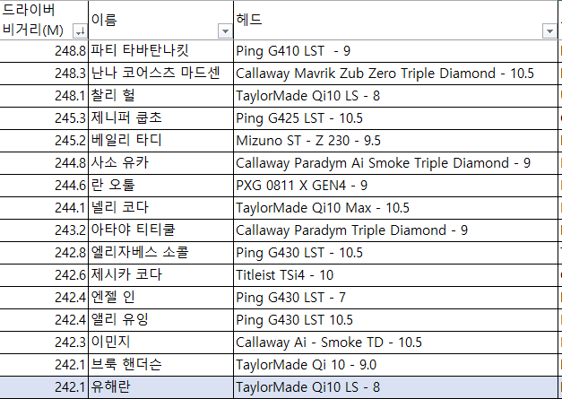 | 242.1 | 유해란 | TaylorMade Qi10 LS - 8 |