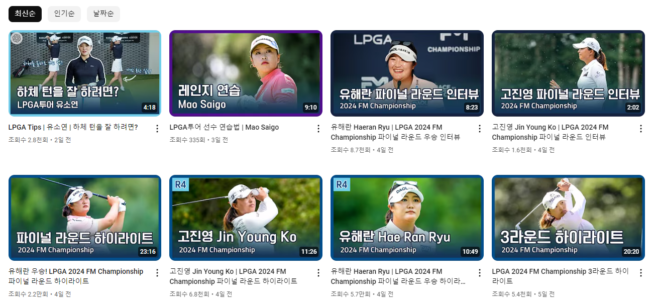 LPGA에서 활약하는 한국인 선수 위주의 채널로 현역 LPGA 투어 프로들의 각종 인터뷰, 기자회견, 레슨 등 다양한 볼 거리로 골라 보는 재미가 있습니다.