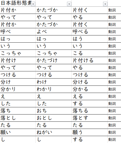 또한 엑셀 시트 2번에는 형태소 분석 사이트에서 분석한 내용도 들어가 있다. 일본어 문장을 넣으면 아래와 같이