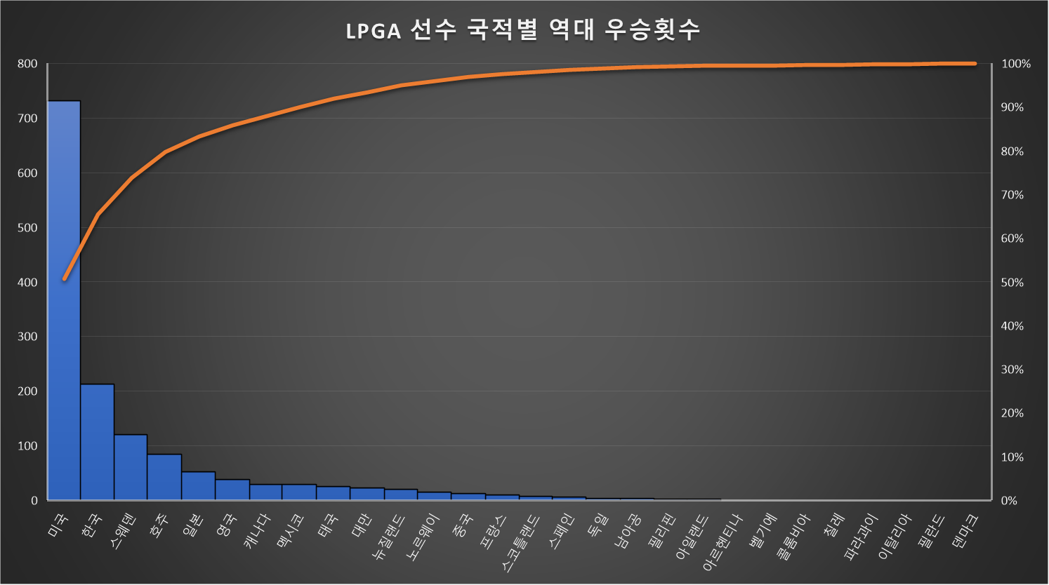 위의 5개국이 LPGA에서 여성골프 강국으로 전체 우승 횟수의 83.3%를 차지했습니다.