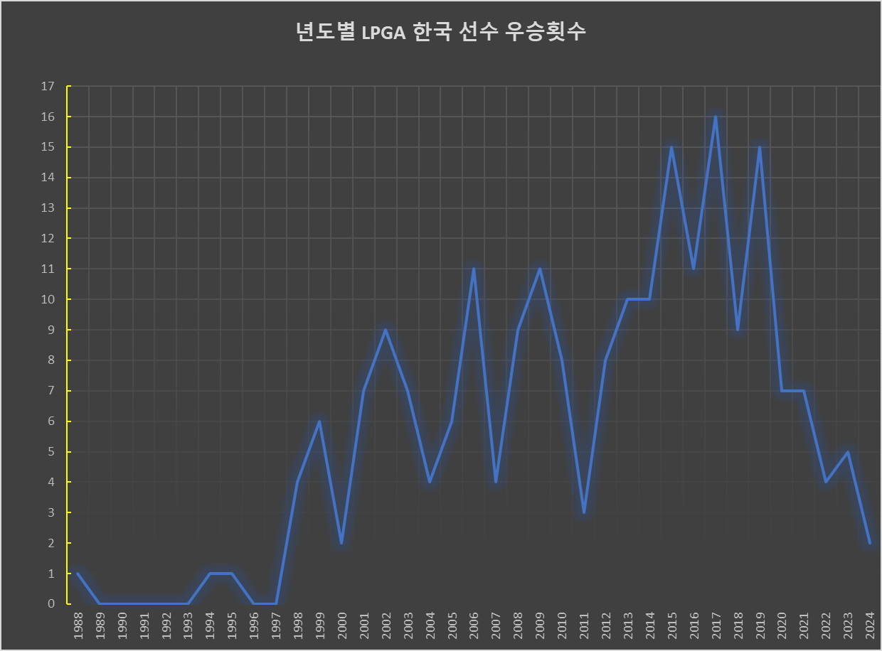 LPGA투어, 한국 선수들 년도별 우승횟수표 (1988~2024)